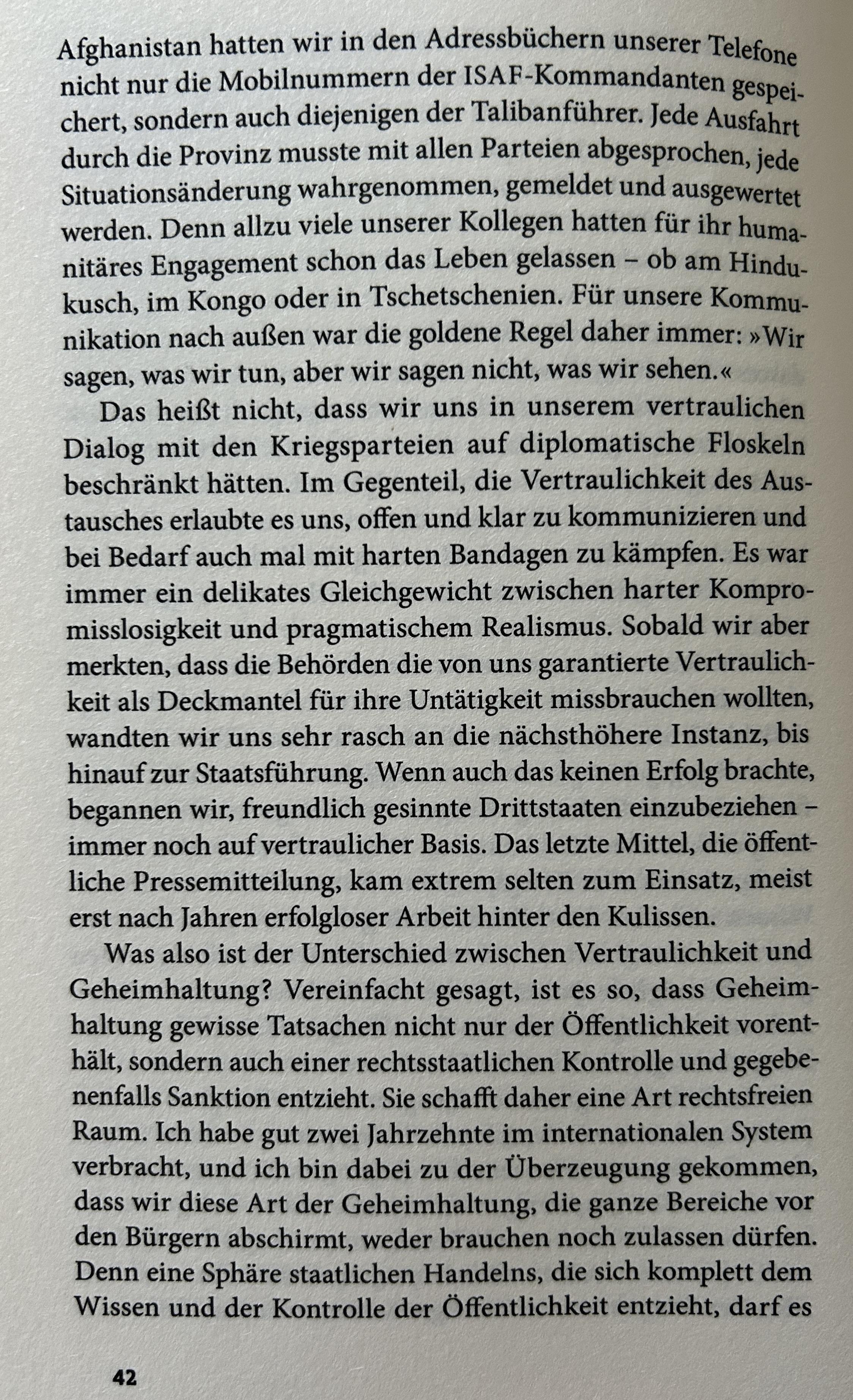 Beim Roten Kreuz mussten wir unser Wissen stets streng vertraulich behandeln. Das war eine Art Lebensversicherung – sowohl für die Kriegsopfer als auch für uns selbst. Denn in einem Kriegsgebiet gibt es nur wenig Schutz. Keine Polizei sorgt für Recht und Ordnung. Zeugen von Kriegsverbrechen sind lästig und können leicht aus dem Weg geschafft werden. Ohne die Gewissheit aller Kriegsparteien, dass das IKRK mit seinem Wissen nicht an die Öffentlichkeit geht, wäre seine Präsenz und humanitäre Arbeit tief in umstrittenen Konfliktgebieten gar nicht möglich. Daher werden IKRK-Mitarbeiter vom Internationalen Strafgerichtshof in Den Haag ausdrücklich von der Zeugenaussagepflicht befreit. Das muss so sein. Denn sobald einmal ein IKRK-Delegierter als Zeuge in einem Kriegsverbrecherprozess aufträte, würde sich jede Kriegspartei zweimal fragen, ob sie der Organisation weiterhin Zugang zu Kriegsgefangenen und zivilen Kriegsopfern gewähren kann und ob Delegierte, die bereits »zu viel wissen«, nicht besser einem »tragischen Unfall« zum Opfer fallen sollten. Gleichzeitig muss man aber auch mit allen Konfliktparteien in ständiger Kommunikation bleiben. InAfghanistan hatten wir in den Adressbüchern unserer Telefone nicht nur die Mobilnummern der ISAF-Kommandanten gespeichert, sondern auch diejenigen der Talibanführer. Jede Ausfahrt durch die Provinz musste mit allen Parteien abgesprochen, jede Situationsänderung wahrgenommen, gemeldet und ausgewertet werden. Denn allzu viele unserer Kollegen hatten für ihr humanitäres Engagement schon das Leben gelassen – ob am Hindukusch, im Kongo oder in Tschetschenien. Für unsere Kommunikation nach außen war die goldene Regel daher immer: »Wir sagen, was wir tun, aber wir sagen nicht, was wir sehen.«