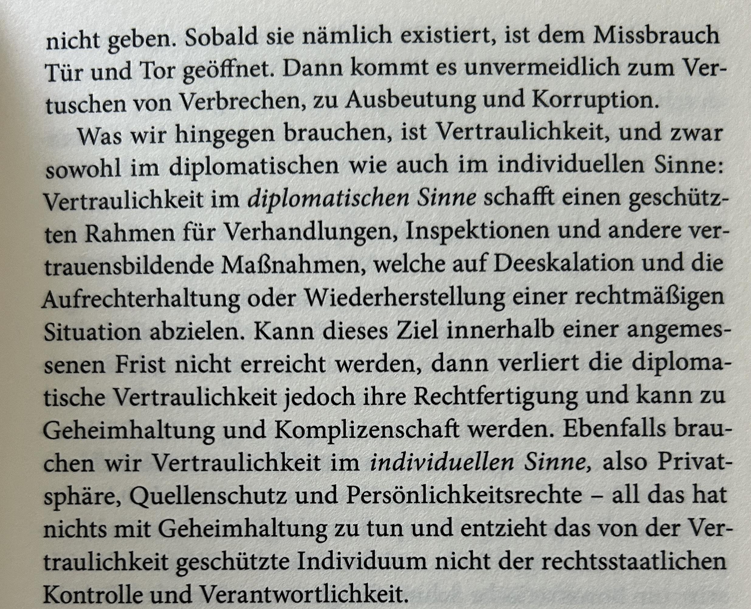 Was wir hingegen brauchen, ist Vertraulichkeit, und zwar sowohl im diplomatischen wie auch im individuellen Sinne: Vertraulichkeit im diplomatischen Sinne schafft einen geschützten Rahmen für Verhandlungen, Inspektionen und andere vertrauensbildende Maßnahmen, welche auf Deeskalation und die Aufrechterhaltung oder Wiederherstellung einer rechtmäßigen Situation abzielen. Kann dieses Ziel innerhalb einer angemessenen Frist nicht erreicht werden, dann verliert die diplomatische Vertraulichkeit jedoch ihre Rechtfertigung und kann zu Geheimhaltung und Komplizenschaft werden. Ebenfalls brauchen wir Vertraulichkeit im individuellen Sinne, also Privatsphäre, Quellenschutz und Persönlichkeitsrechte – all das hat nichts mit Geheimhaltung zu tun und entzieht das von der Vertraulichkeit geschützte Individuum nicht der rechtsstaatlichen Kontrolle und Verantwortlichkeit.​​​​​​​​​​​​​​​​