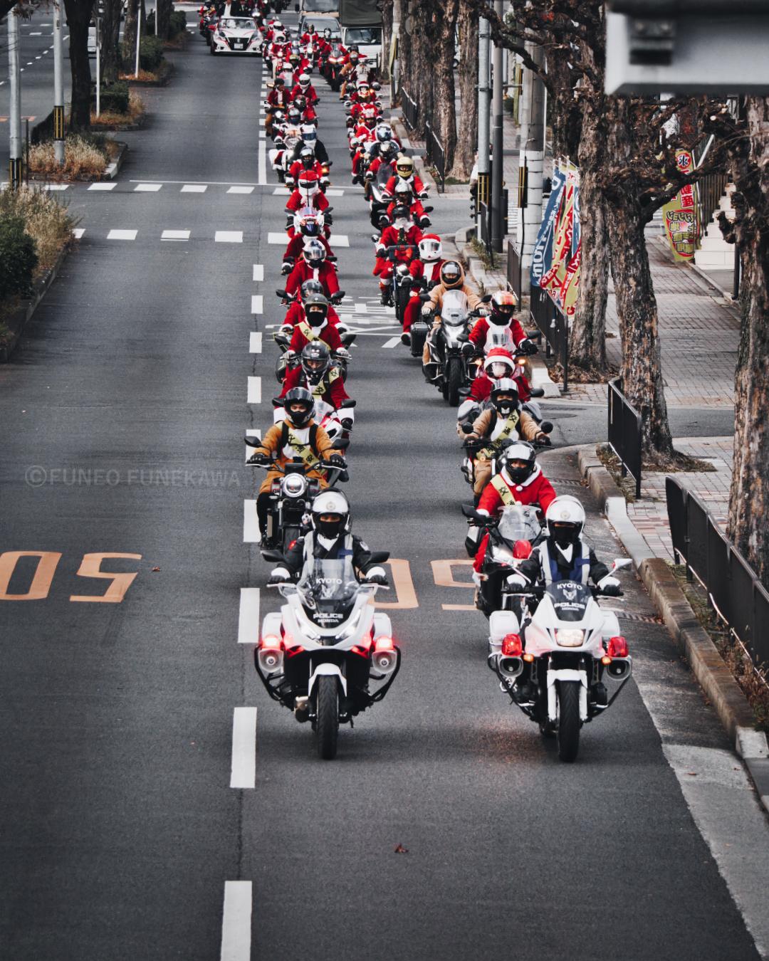 Many Santa Clauses are riding their bikes down the main streets of Kyoto.