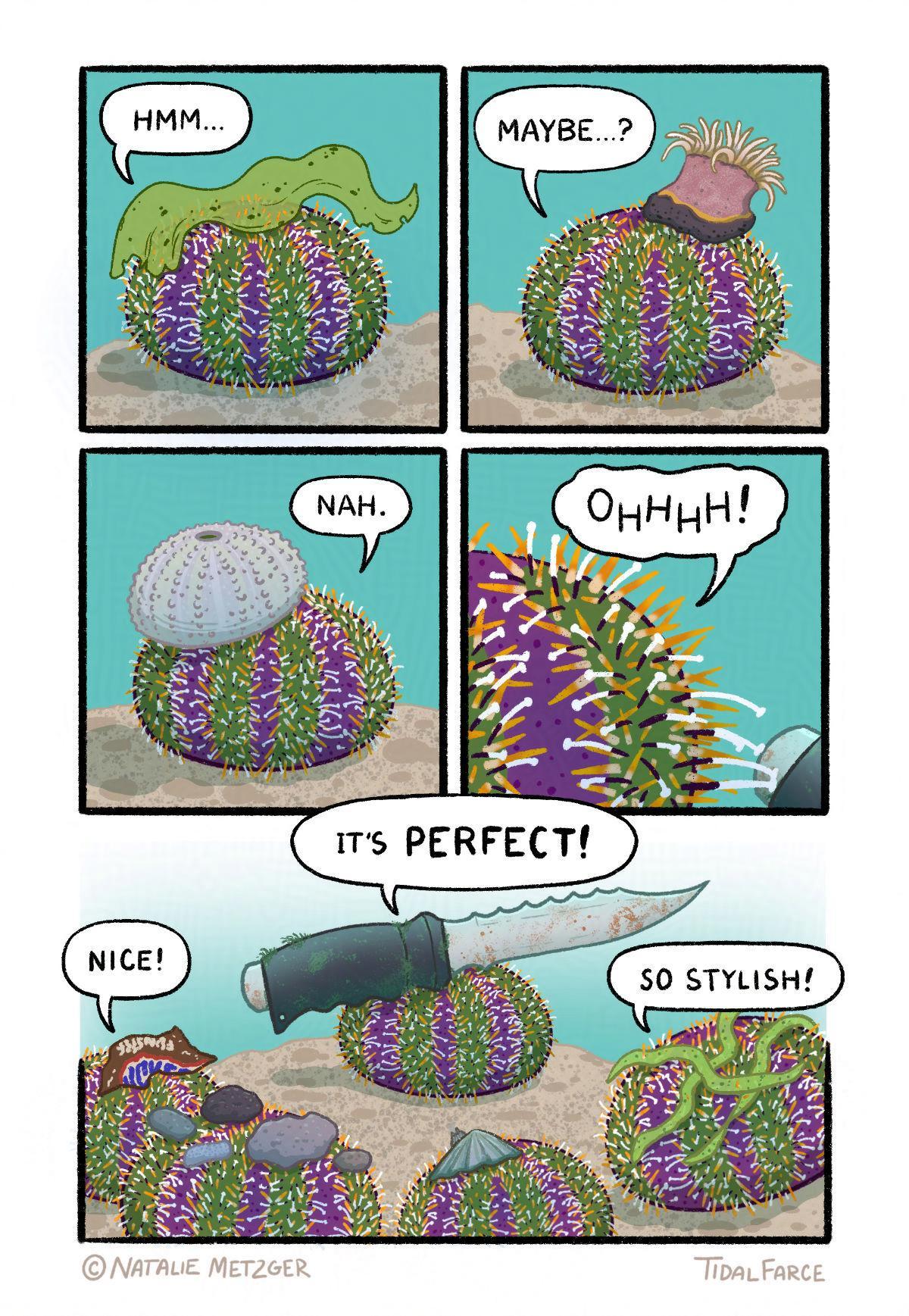 More info about this urchin at the comic page -> https://tidalfarce.com/index.html?pg=11#showComic