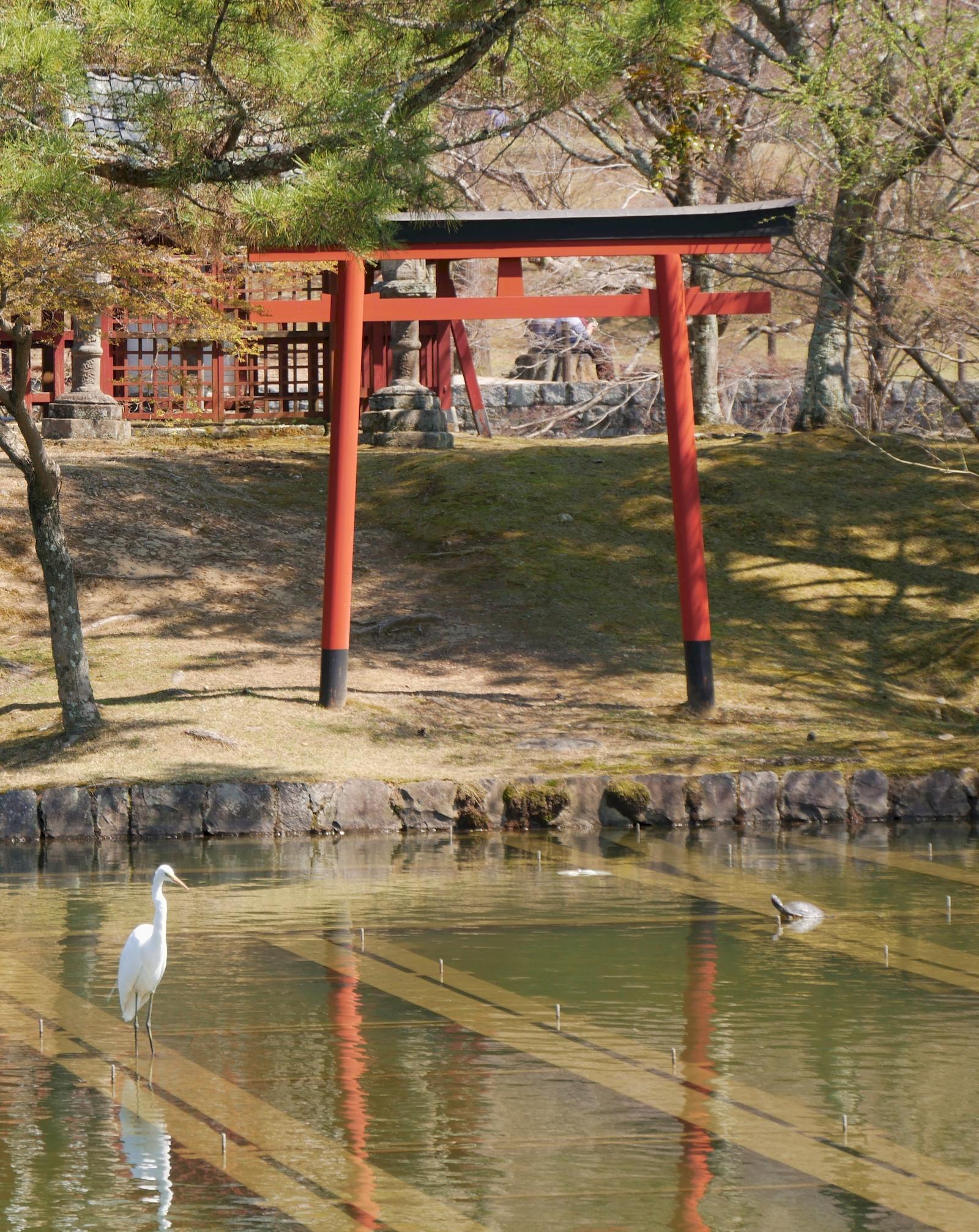 Ruhig und beschaulich wirkt diese Szene aus der Tempelanlage des Tōdai-ji im japanischen Nara: Reiher und Schildkröte vor einem rotlackierten Torii ...