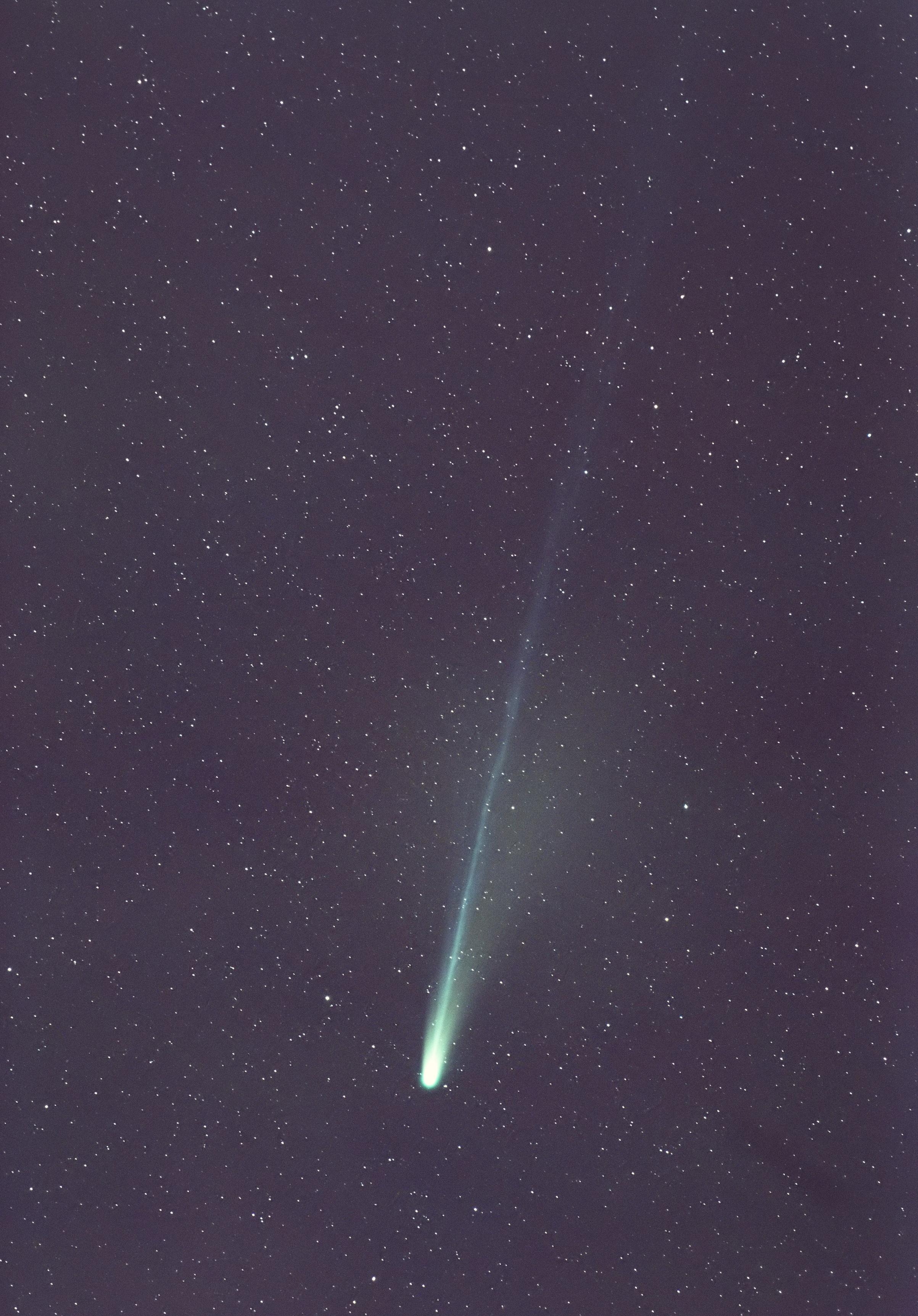 The straight, bluish plasma tail is visible over a length of ~6° (12 full moon diameters). The curved dust tail is a lot shorter.