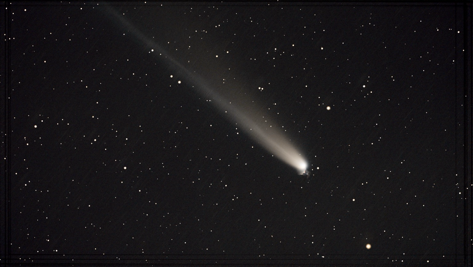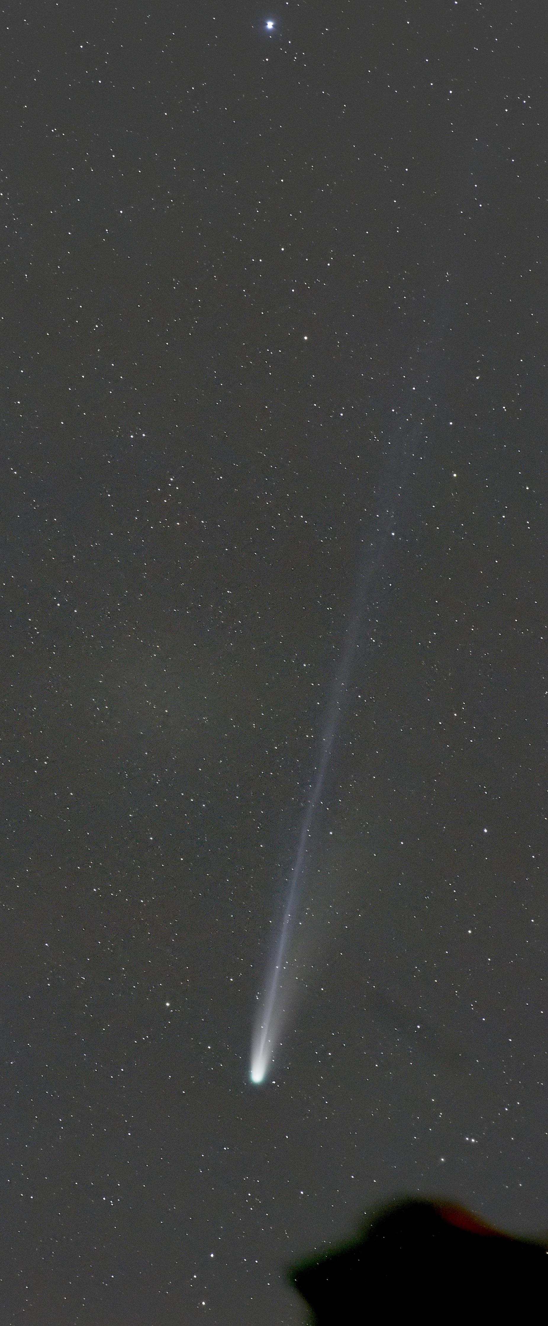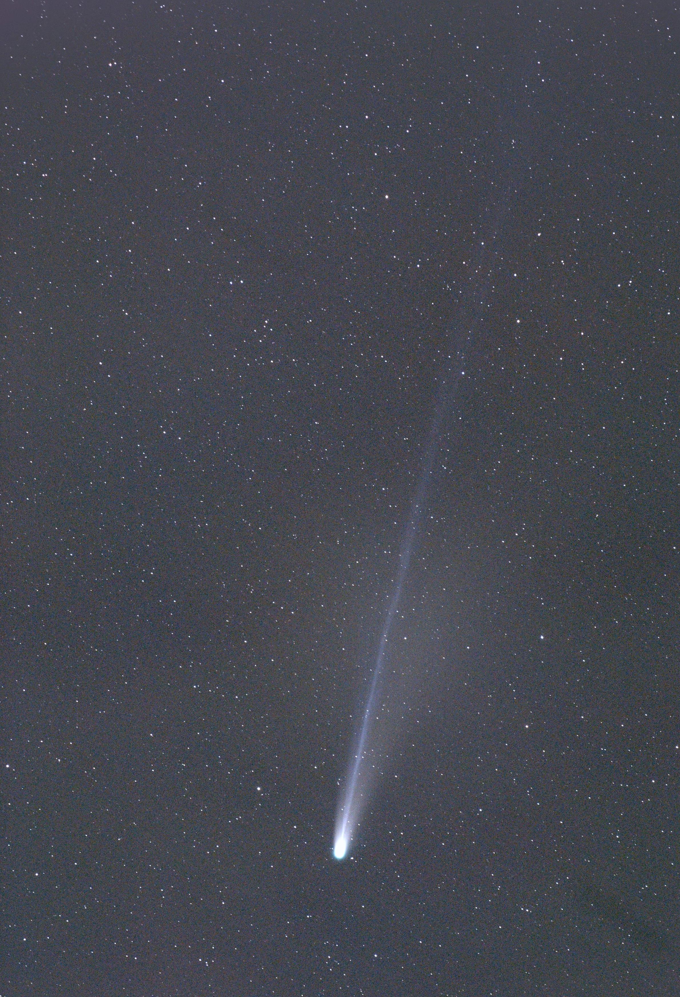 Der gerade. bläuliche Plasmaschweif ist über eine Länge von rund 6° (12 Vollmonddurchmesser) erkennbar. Der gebogene Staubschweif ist deutlich kürzer.