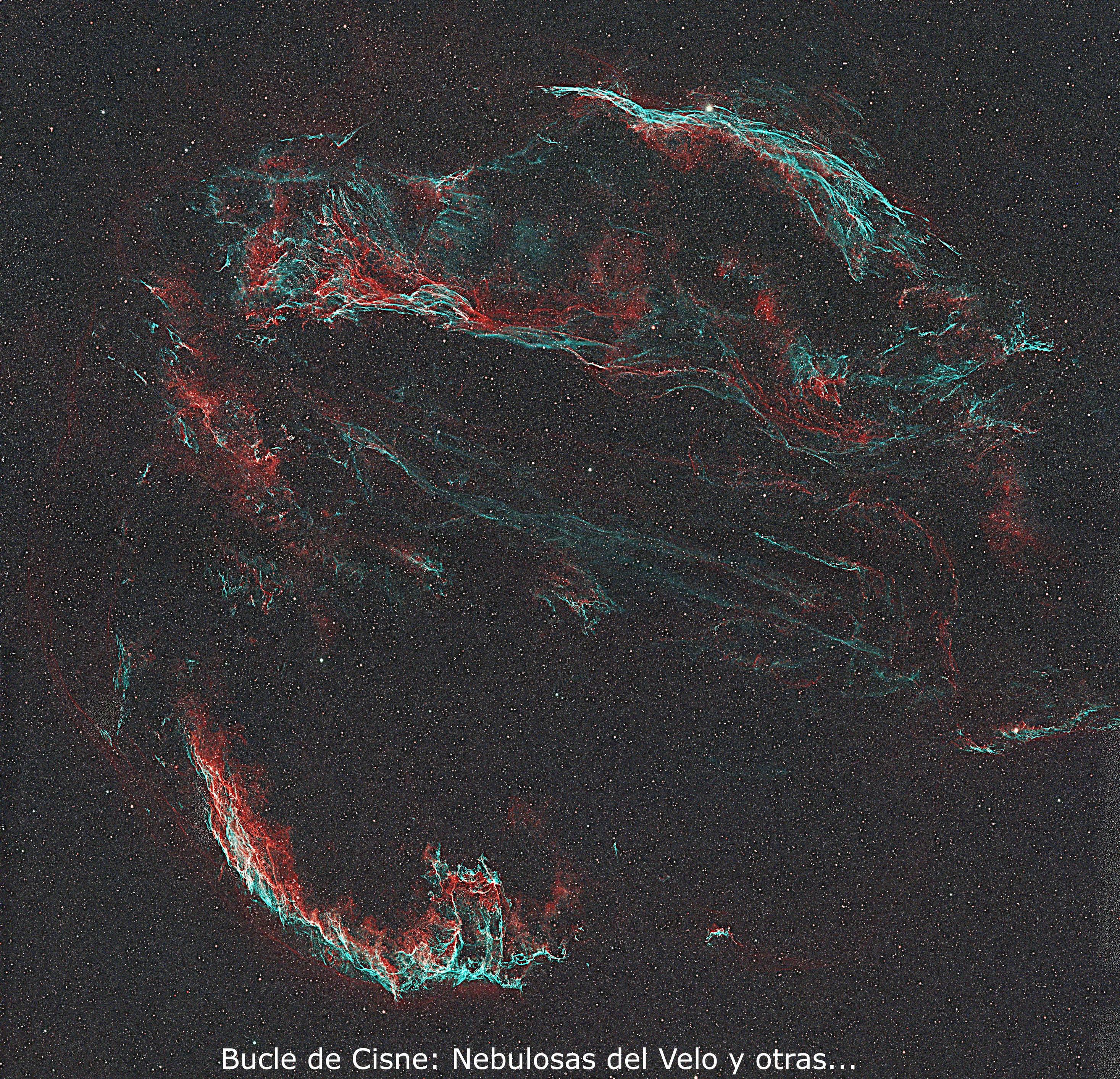 Las Nebulosas del Velo Occidental y Oriental son las más prominentes del llamado Bucle de Cisne, que es un conjunto de nebulosas casi todas restos de supernovas.