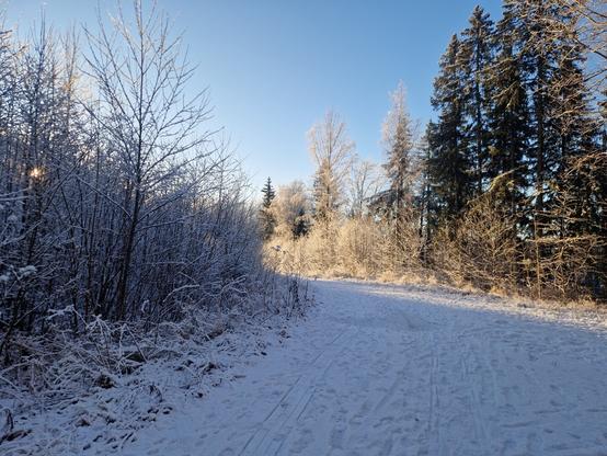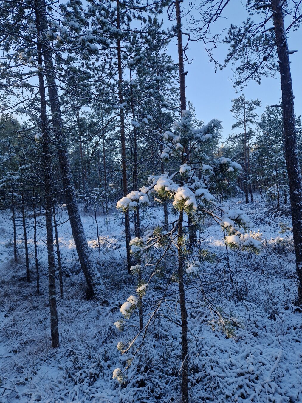 A serene alpine forest blanketed in fresh, powdery snow under a clear blue sky.