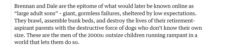 This is spot on, I've always felt that not only is Stepbrothers fucking funny but also a mirror on America just before the Fall, idiot man children wrapped up in privilege who are indulged rather than told off. And now look at the place!