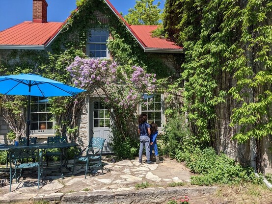 Serene Sunday. Outdoor dining patio in a converted moulin (mill) alongside a leaf-strewn canal in northern France.