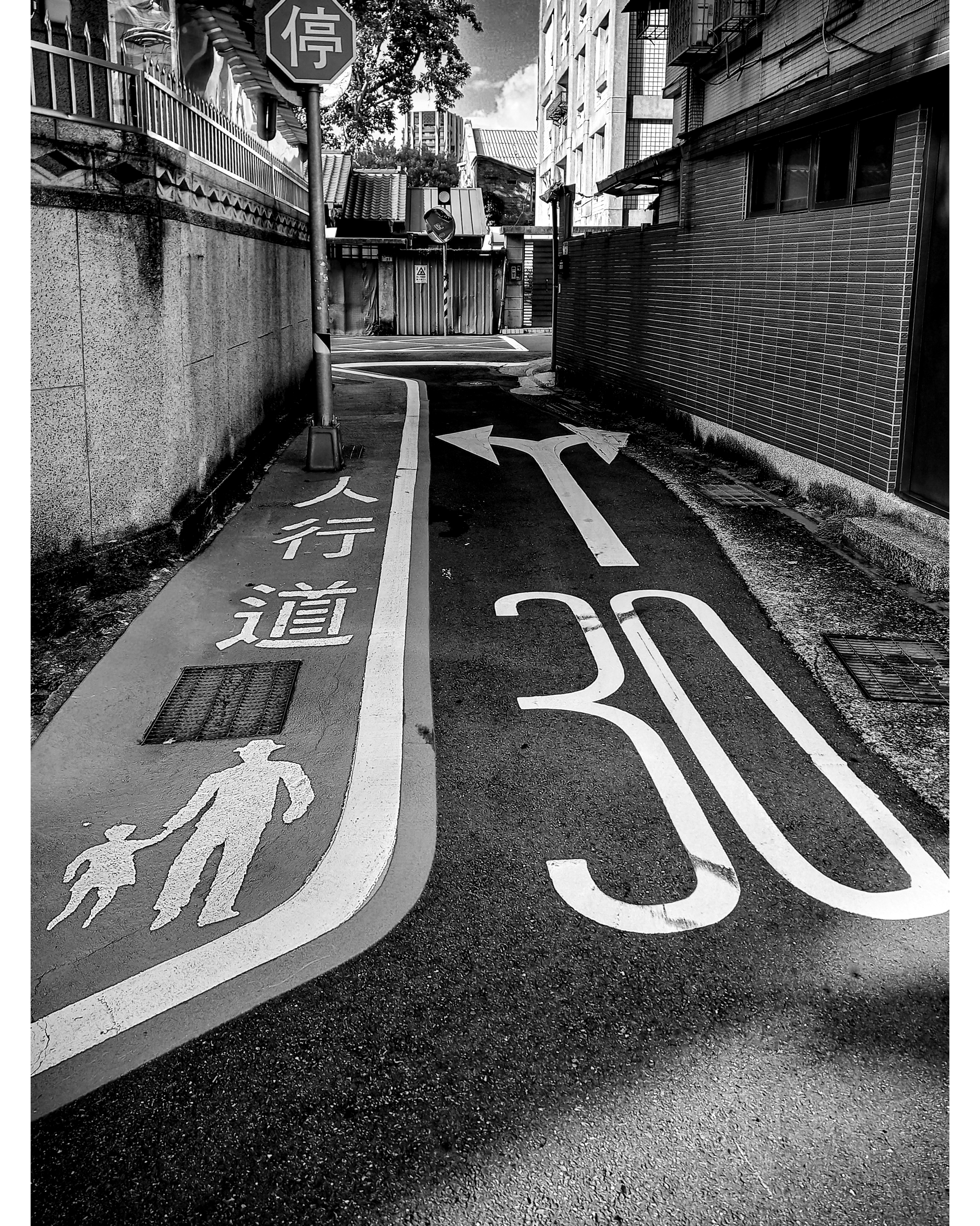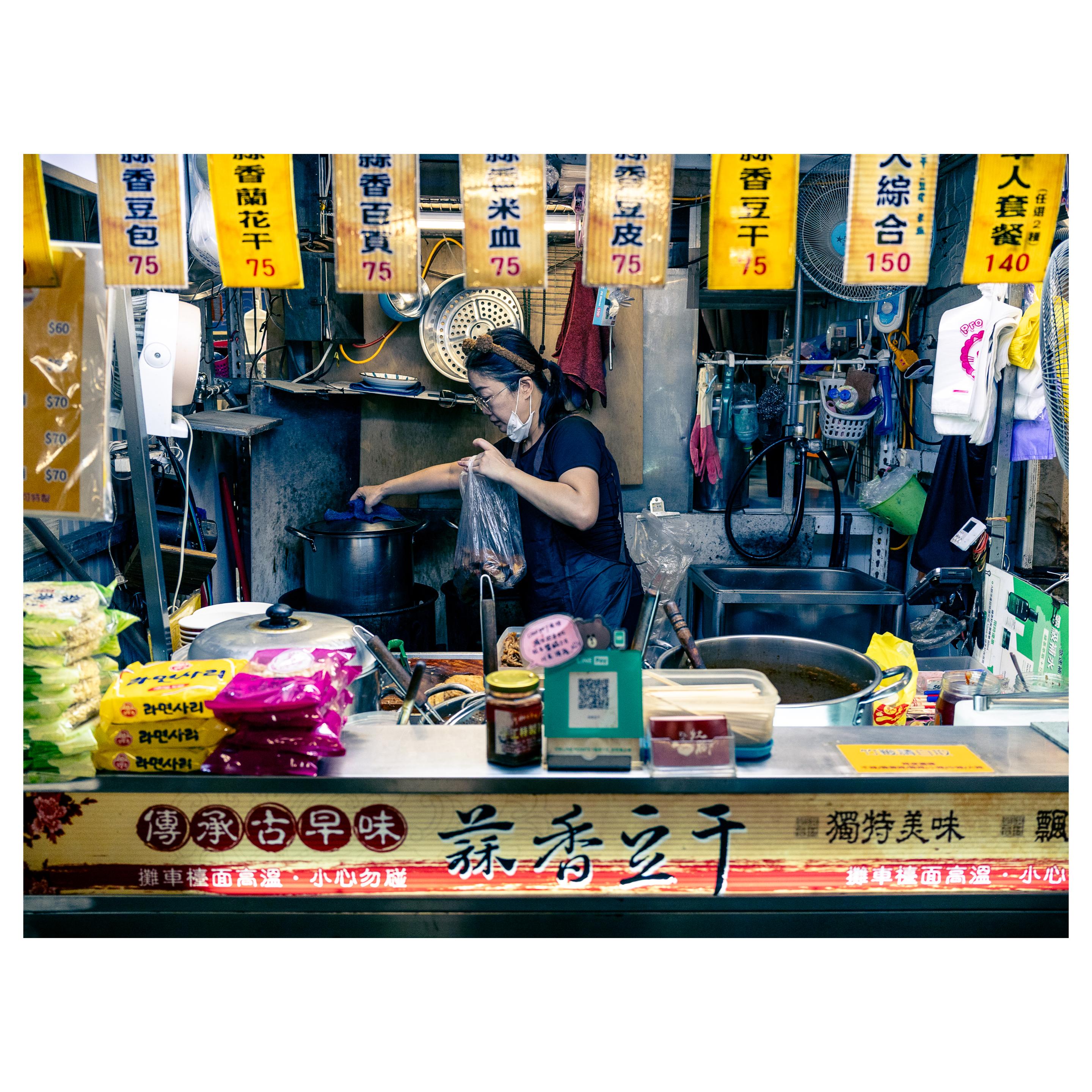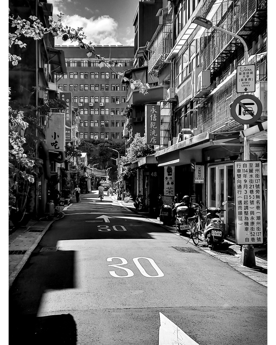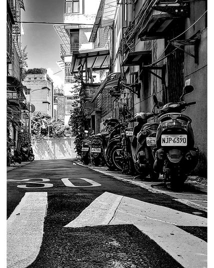 Typical Taipei backstreets, where low-rise buildings with aging apartments, metal grilles and tiled surfaces echo the city’s hybrid architectural heritage. While clustered parked scooters rest in the shadow, traces of Japanese colonial influence linger in the street layout and compact residential scale, giving the alleys a serene, slightly nostalgic mood.