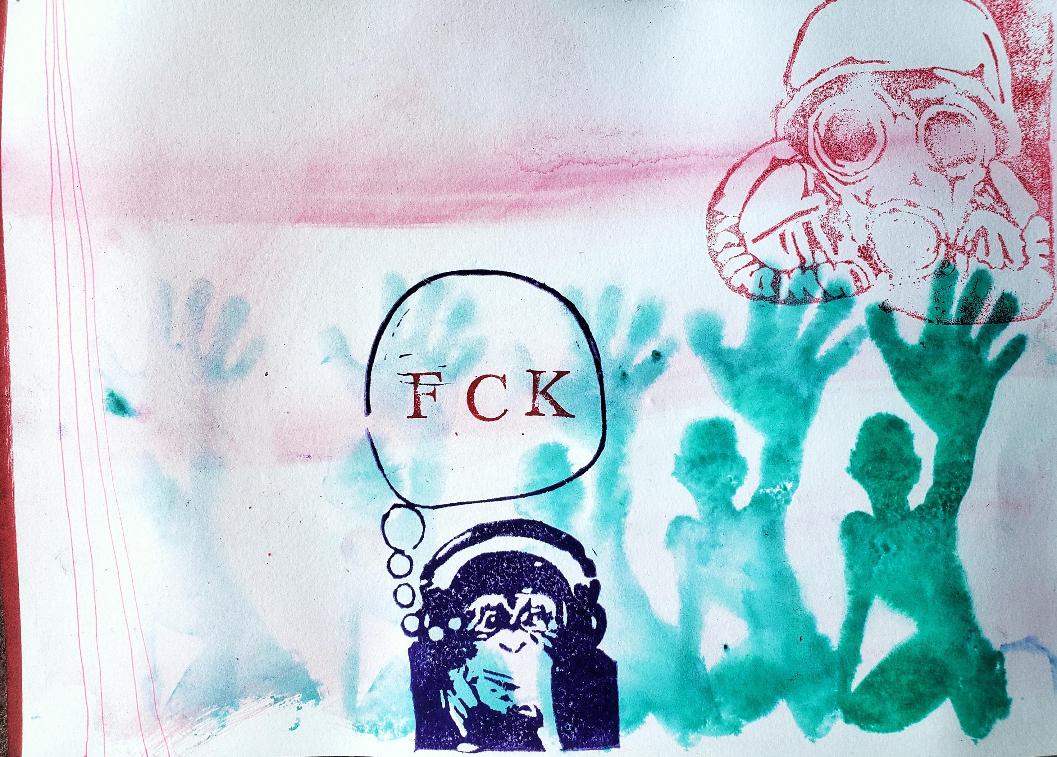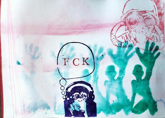 #kunst #contemporaryArt #mentalCinema #analogArt #painting #rubberStamp #reliefPrinting #saveBioDiversity #climateActionNow #systemChange #endFossilFuels #makeArtNotWar #noAFD #NoRacism #NoFascism #humanRights #humanDignity #Нетвойны #monkeyThinking #monkeyDreaming #speechBubble #fck #swearing #gasmask #soldier #suffocate #asphyxia #atmosphere #biosphere #airPollution #hold #stop #stopThem #protest #wait #help #raisedHand