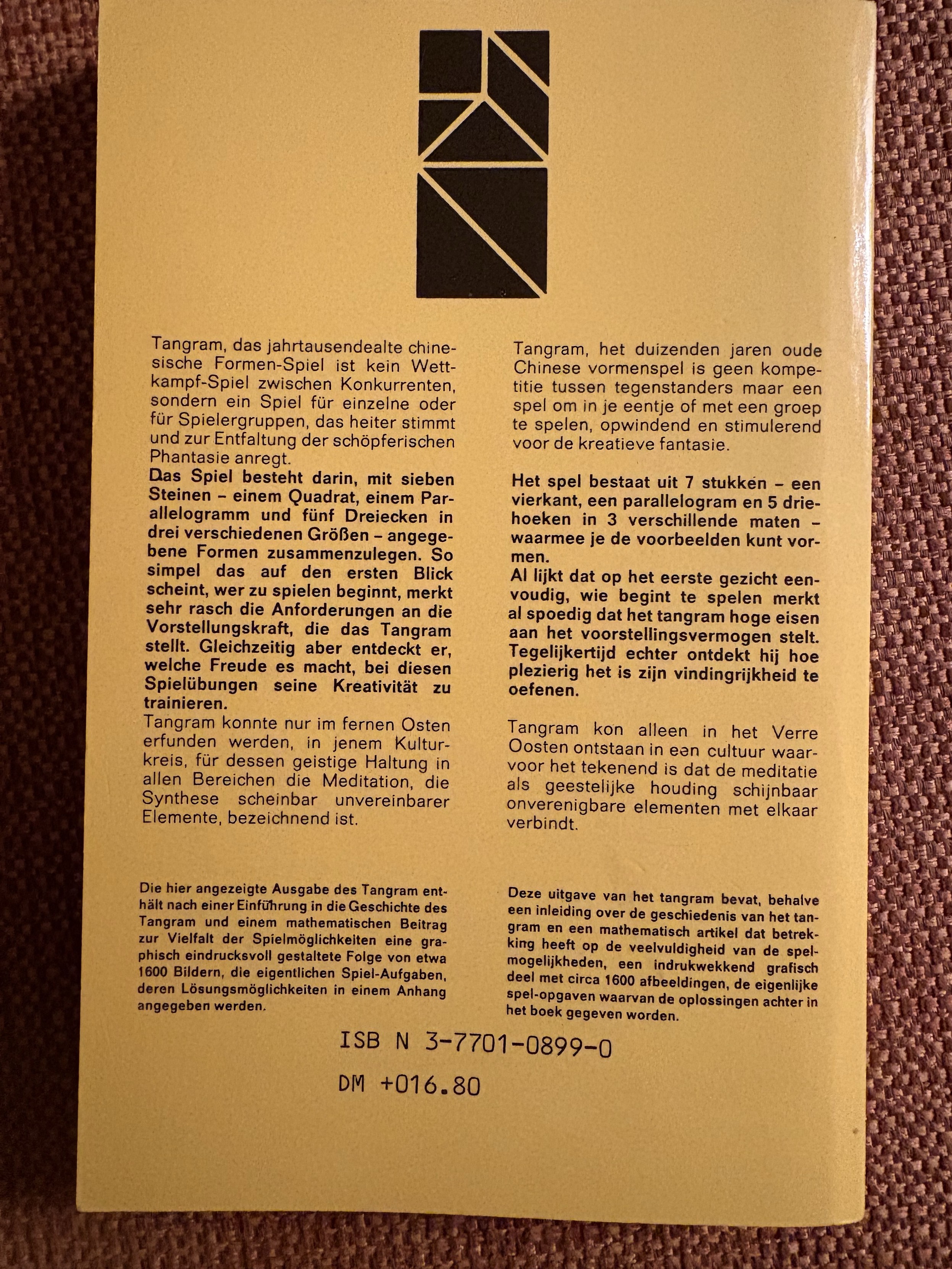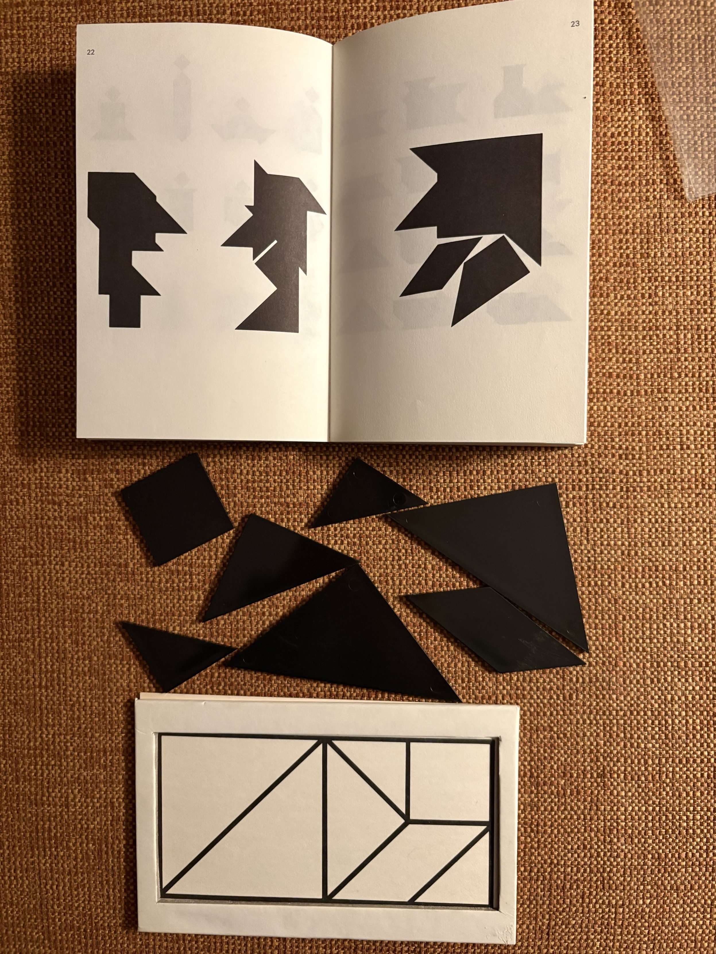 Wenn einmal nix Gescheites im Fernsehen kommt, lege ich gerne (analog!) #Tangram -Figuren. Sehr meditativ! Gar nicht so einfach, alle 7 PlĂ€ttchen zu jeweils einer abgebildeten Figur aus dem Buch zu legen; es dĂŒrfen keine ĂŒbrig bleiben.