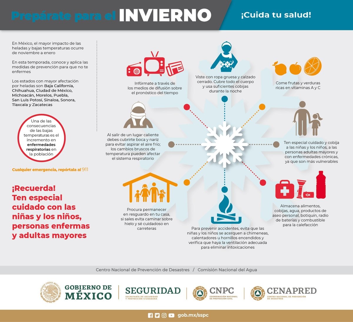 También se exhortó a aplicar crema para proteger la piel del frío, ingerir abundante agua, y consumir frutas y verduras ricas en vitaminas A y C, con el propósito de fortalecer el sistema inmunológico.