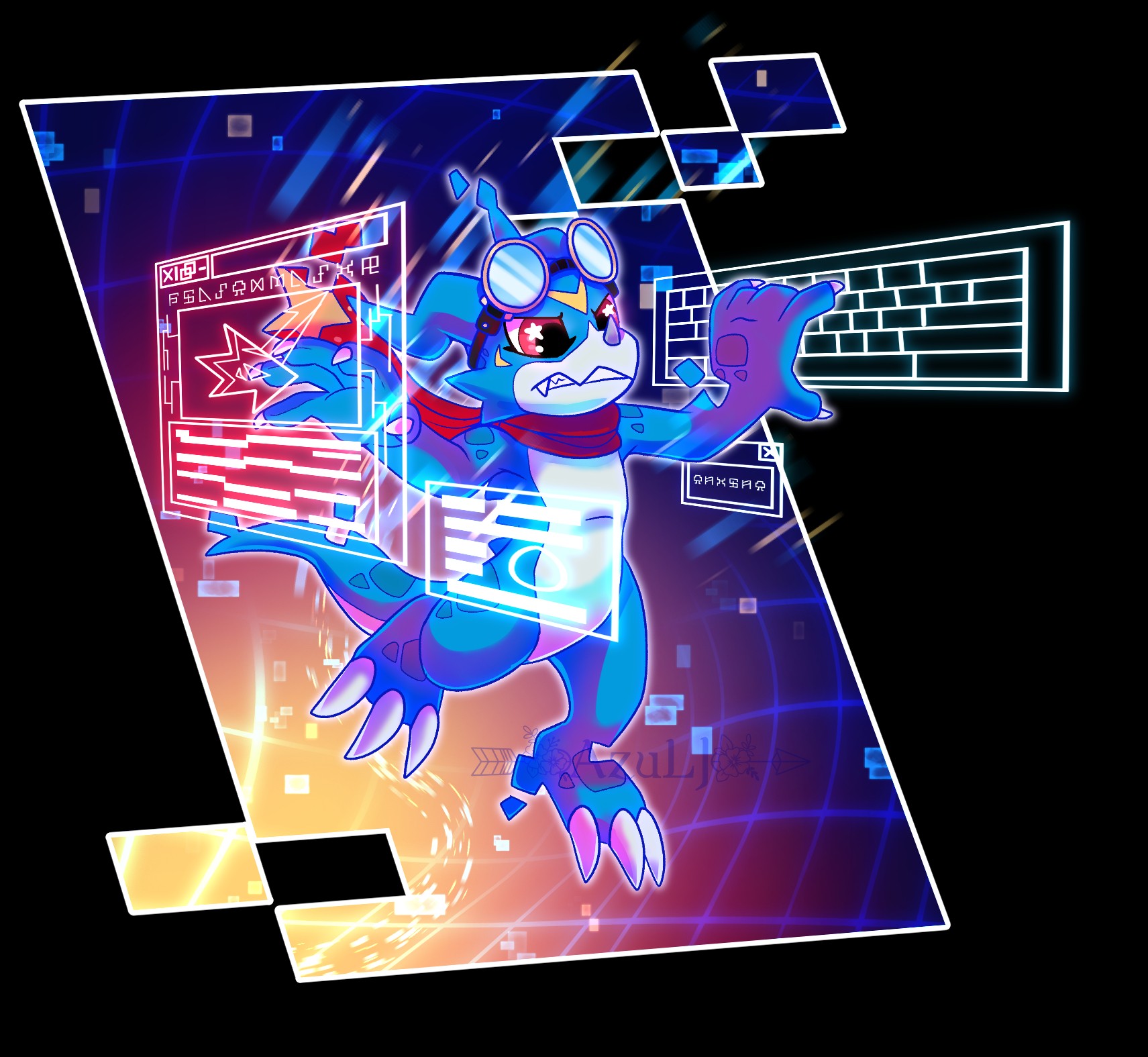 My take on Veemon X as a concept, no such Digimon currently exists. The design is still a work in progress and I might change it in future artwork! Also, that's a Pink Lemonade flavor Ghost, my favorite energy drink.