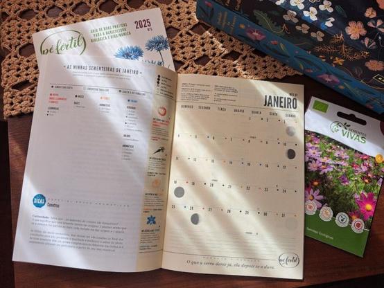 Há tempos encontrei este guia de plantação chamado Pé Fértil, é uma publicação que contém alguns artigos sobre cultivo de plantas. Tem um calendário para cada mês do ano, com a indicação das plantas que se podem semear nesse mês e espaço para apontar o que se semeou, plantou, ou outras tarefas que queiramos registar.