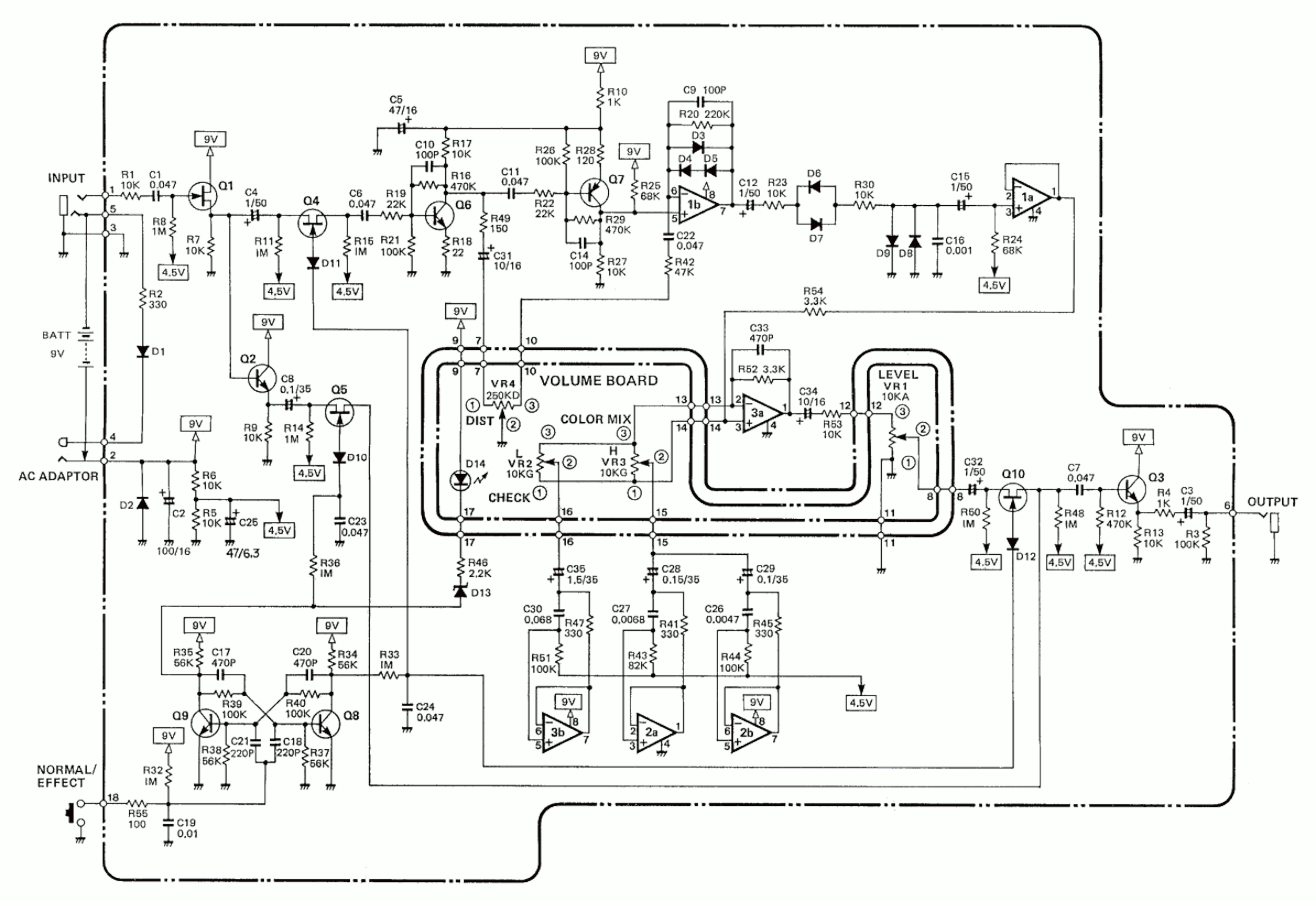 This image is the schematic for the #HM2. It's not the most complicated pedal, but it's a league above something like an Ibanez Tube Screamer. As far as active devices go, it's got 6 #opamps and 10 #transistors of various types, along with a bunch of diodes for multiple types and stages of clipping, and the usual jumble of capacitors and resistors. Oh, and four potentiometers.