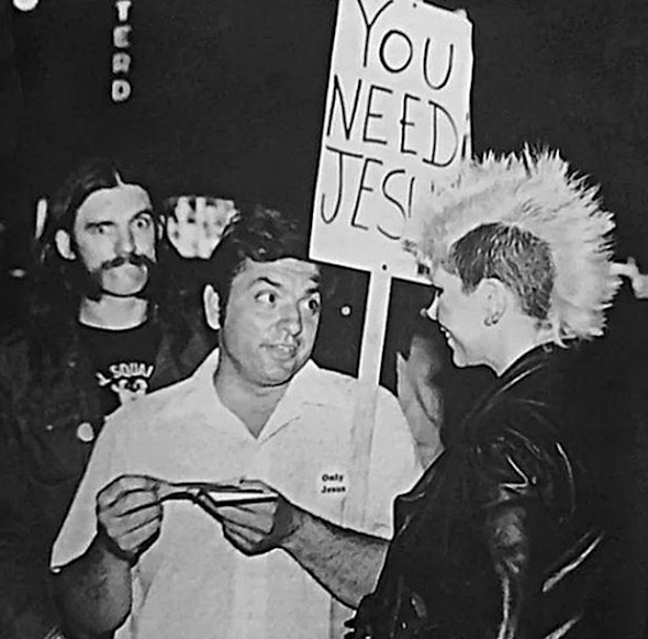 I love this photo of Lemmy (with Wendy O. Williams I believe). His expression behind the religious dude is amazing.