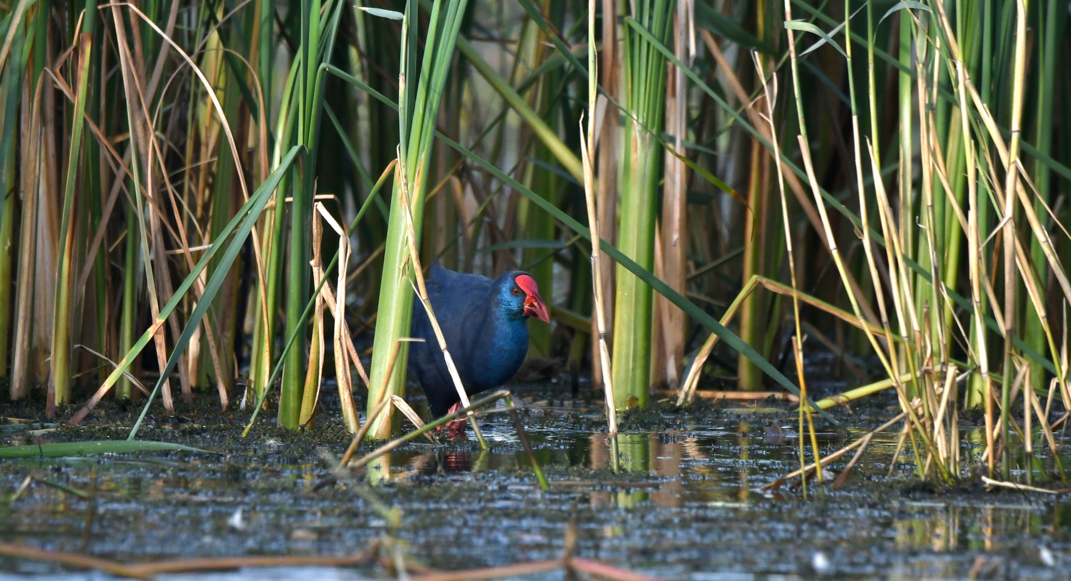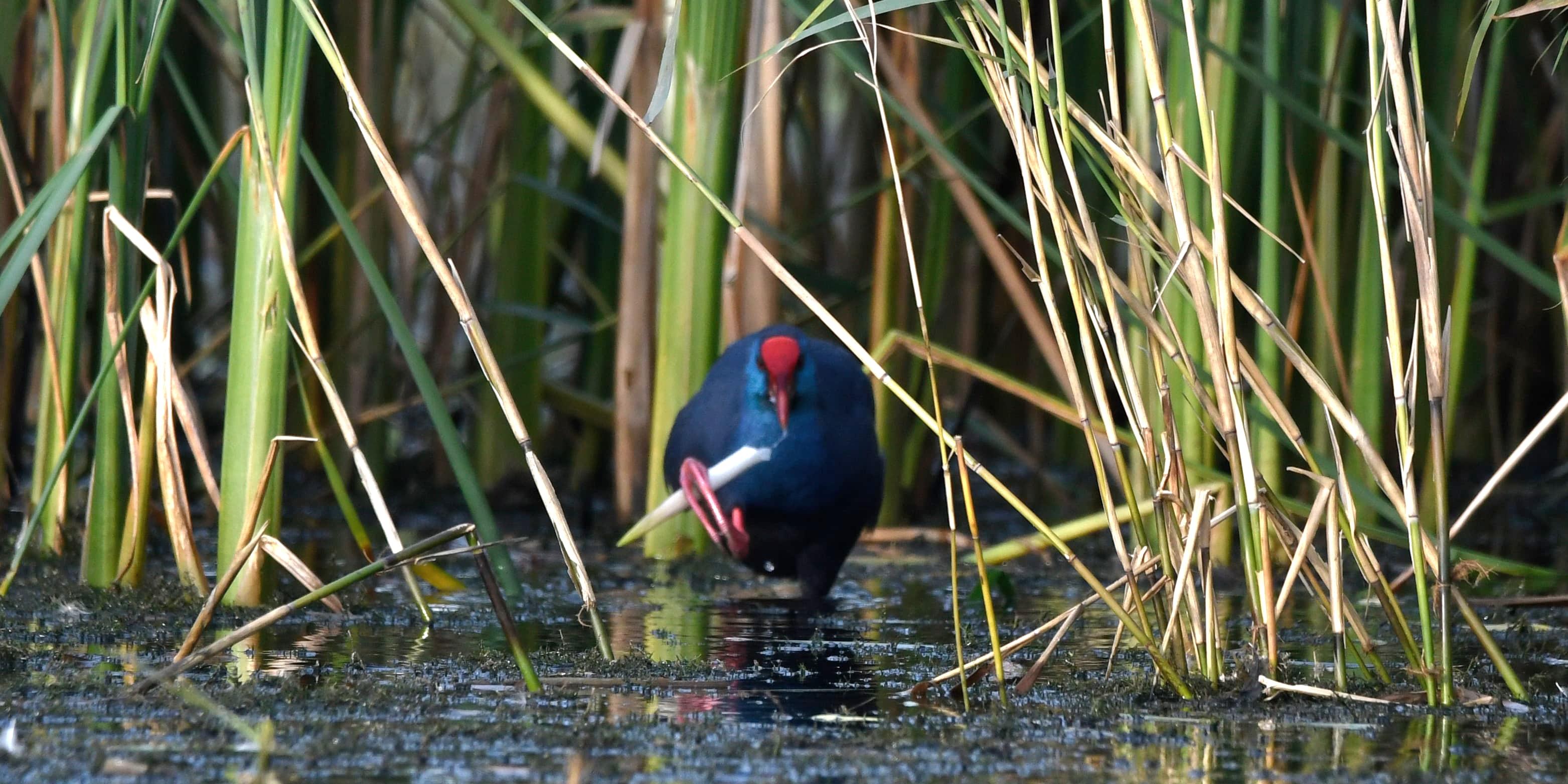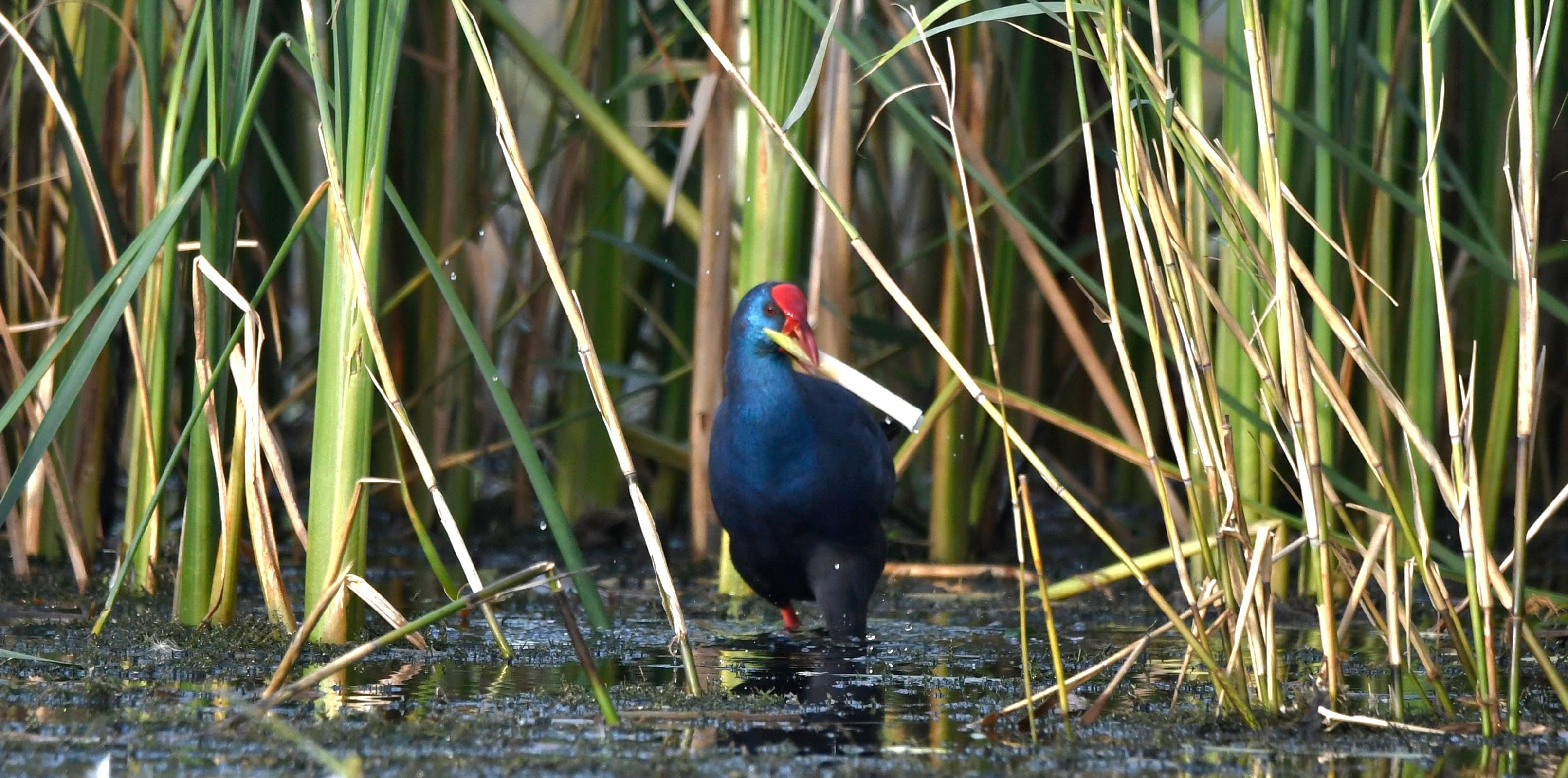 De witte zachte onderkant van de lisdodde stengels vind hij lekker, hij knipt ze af met zijn sterke scherpe snavel.