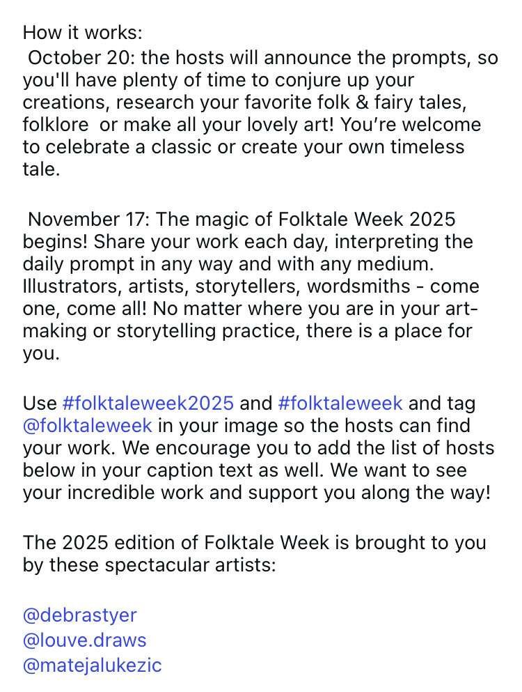 There’s always a lot of magic submissions and it’s open to all. Post your work during November 17 to 23 and tag it with #folktaleWeek #FolktaleWeek25 so we can see and share what everyone has created. This mainly occurs on Instagram but many, like me, will also be posting here. You should join!