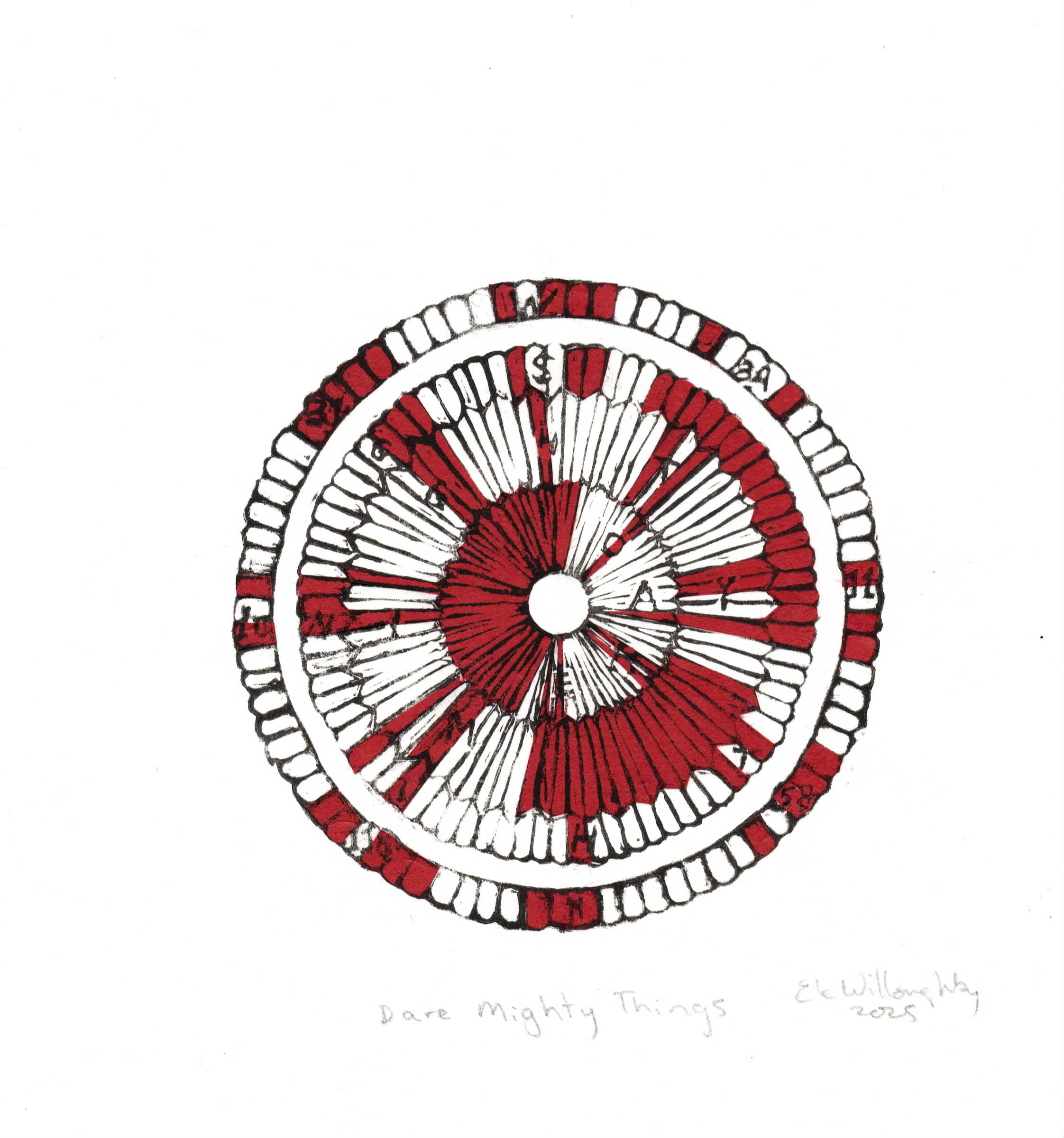 This is a collaged lino block print with an image of the parachute deployed during the descent of the Mars Perseverance rover as it landed on the planet February 18, 2021. The spacecraft team selected the red and white stripes to encode a secret message in binary: "DARE MIGHTY THINGS" along with