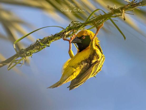 Male weaver bird looking like he's doing pull ups. He is actually starting to build a nest - Mauritius Jun 25