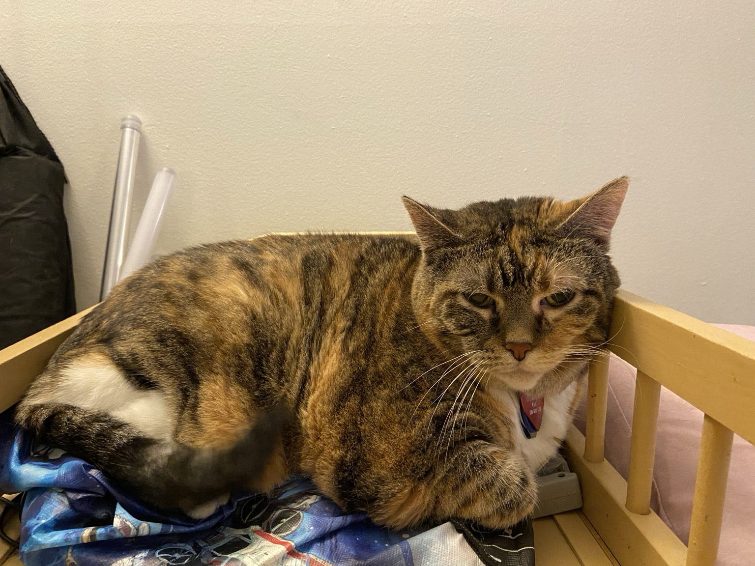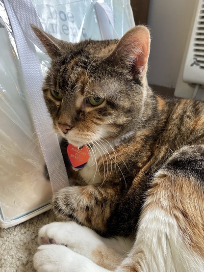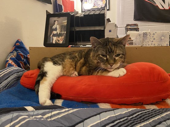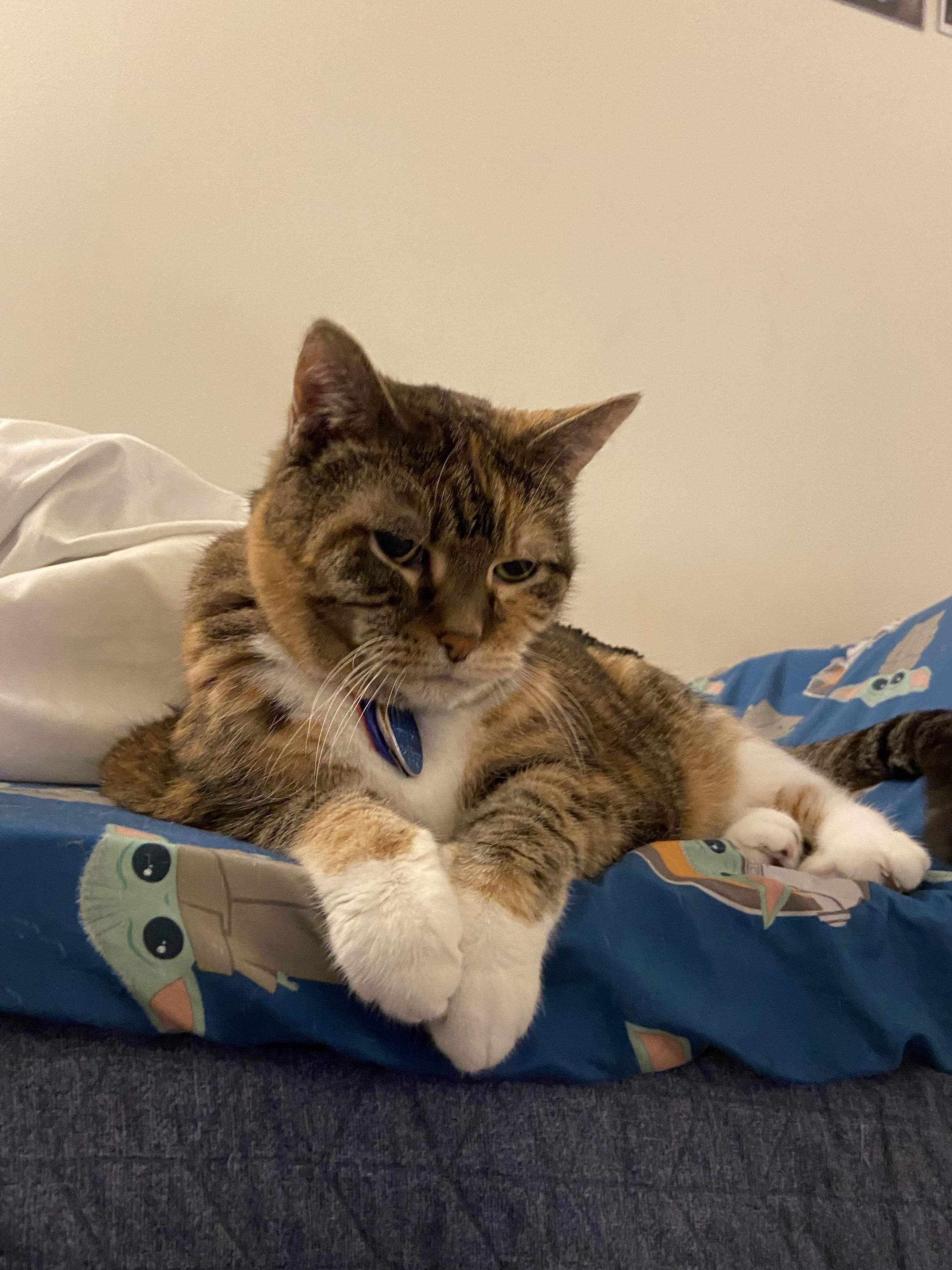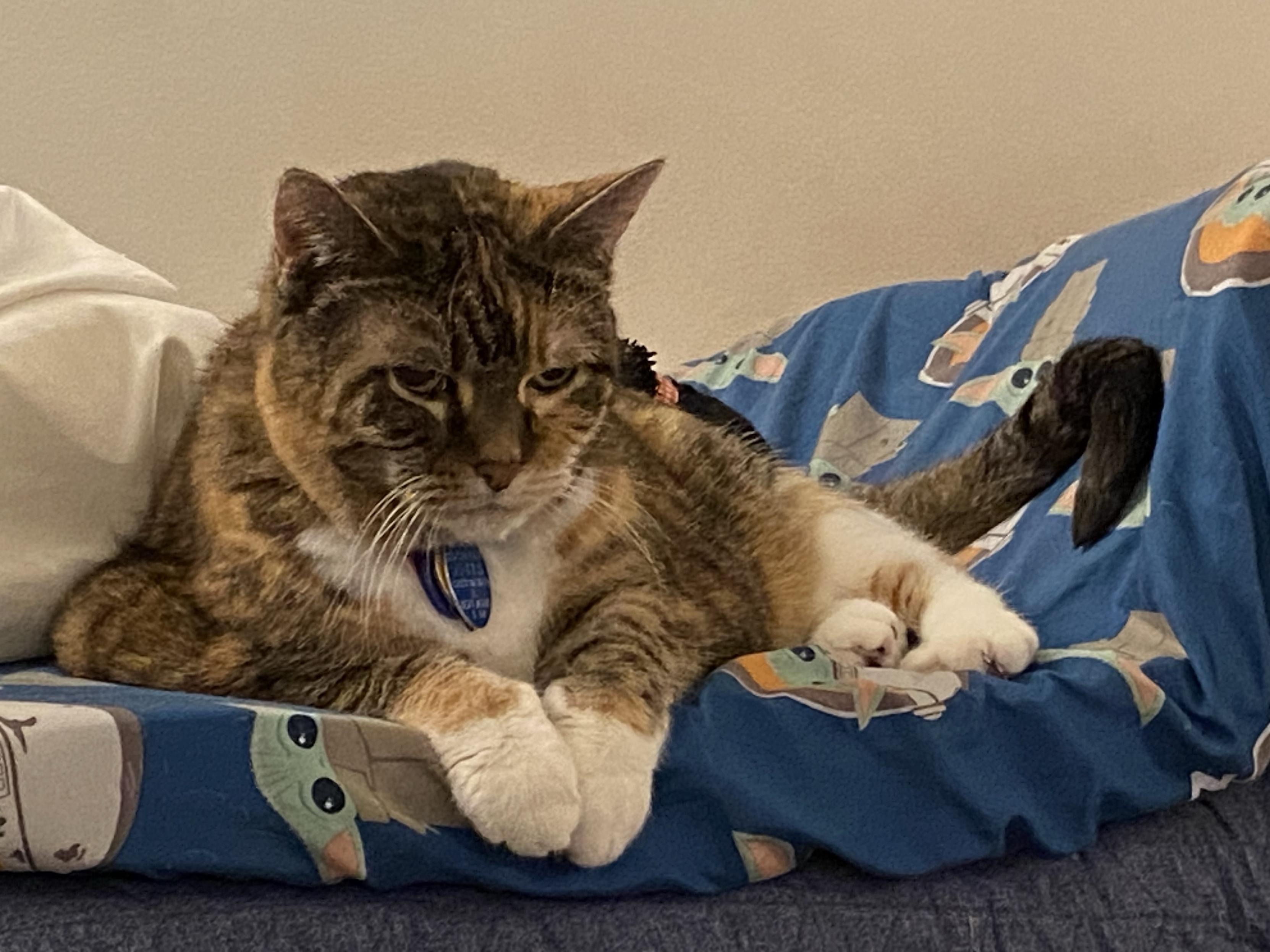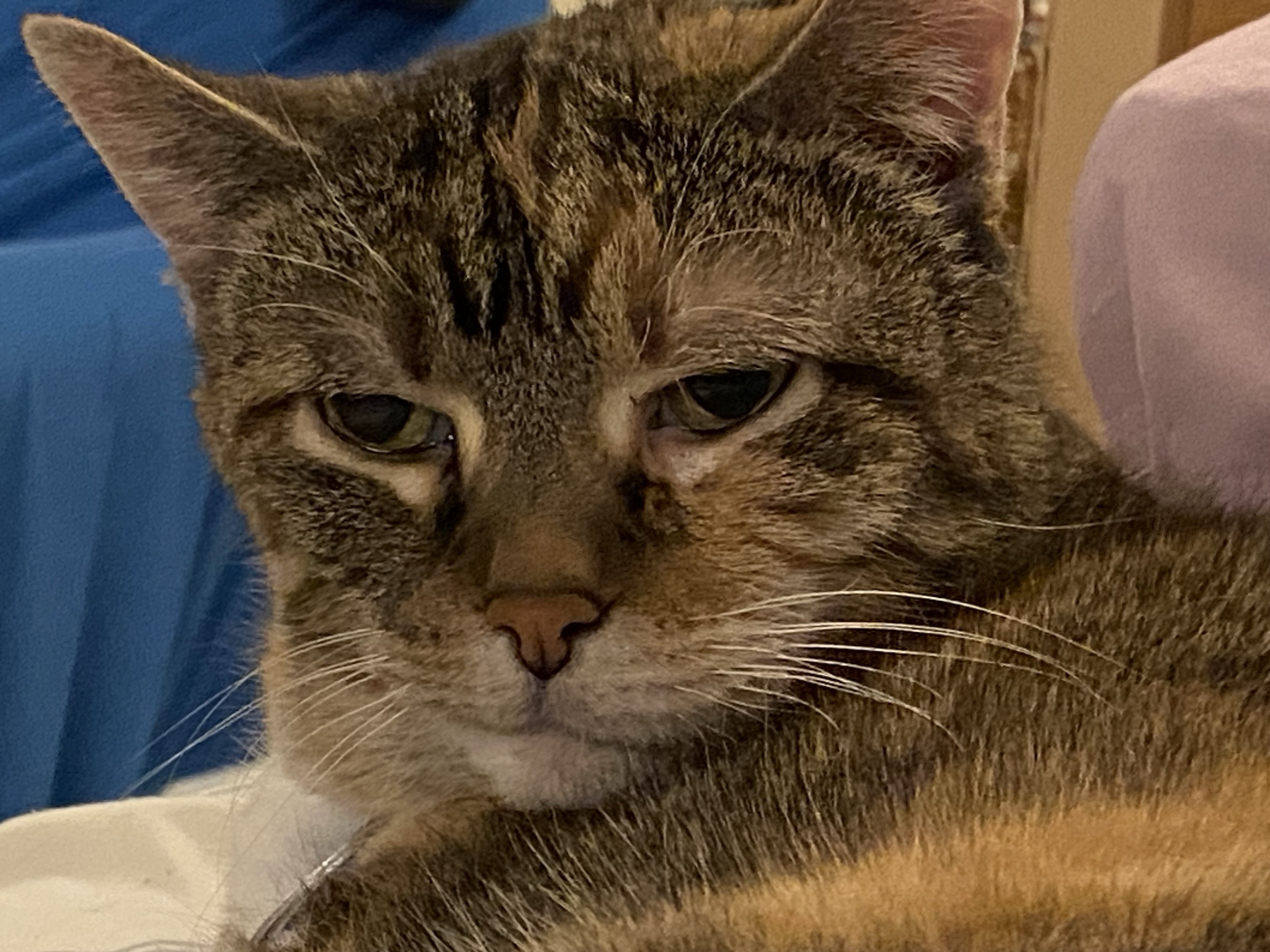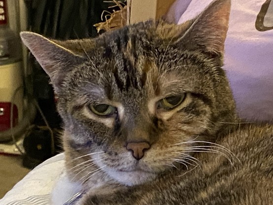 Eva the #QueenKitty from her previous vet visit. Damn the vets were quick to make this 17 year-old #feline a #purrito. This is from about a month ago. I was afraid she’d get upset if she looked over my shoulder as I post these. #cats #queenkitty👑 #felinelove #whiskerweekend #CatsOfMastodon #catsunited #catstodon #catsofthefediverse