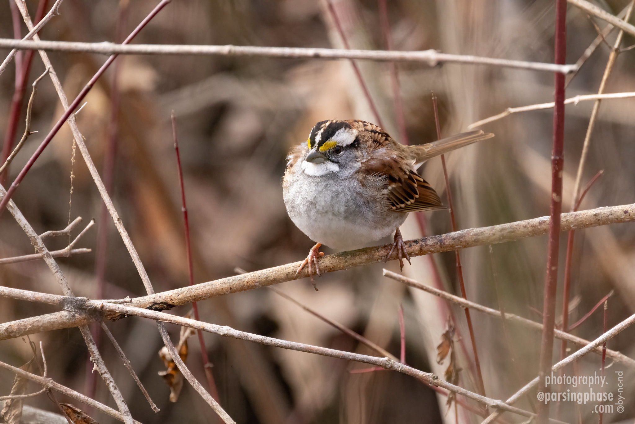 While walking toward the area east of Spring Lake toward the Abbott Brook and Watson Woods Trails I heard and saw multiple calls from White-throated Sparrow. I stopped and waited a few minutes. It was not long before a White-throated Sparrow (Zonotrichia albicollis) perched on a thin branch among a tangle of bare twigs and brambles. The birdâs puffed-up plumage, white throat patch, and distinctive black-and-yellow striped head stand out. In the second image, the sparrow faces forward, [âŠ]https://islandinthenet.com/white-throated-sparrow-at-abbott-marshlands/