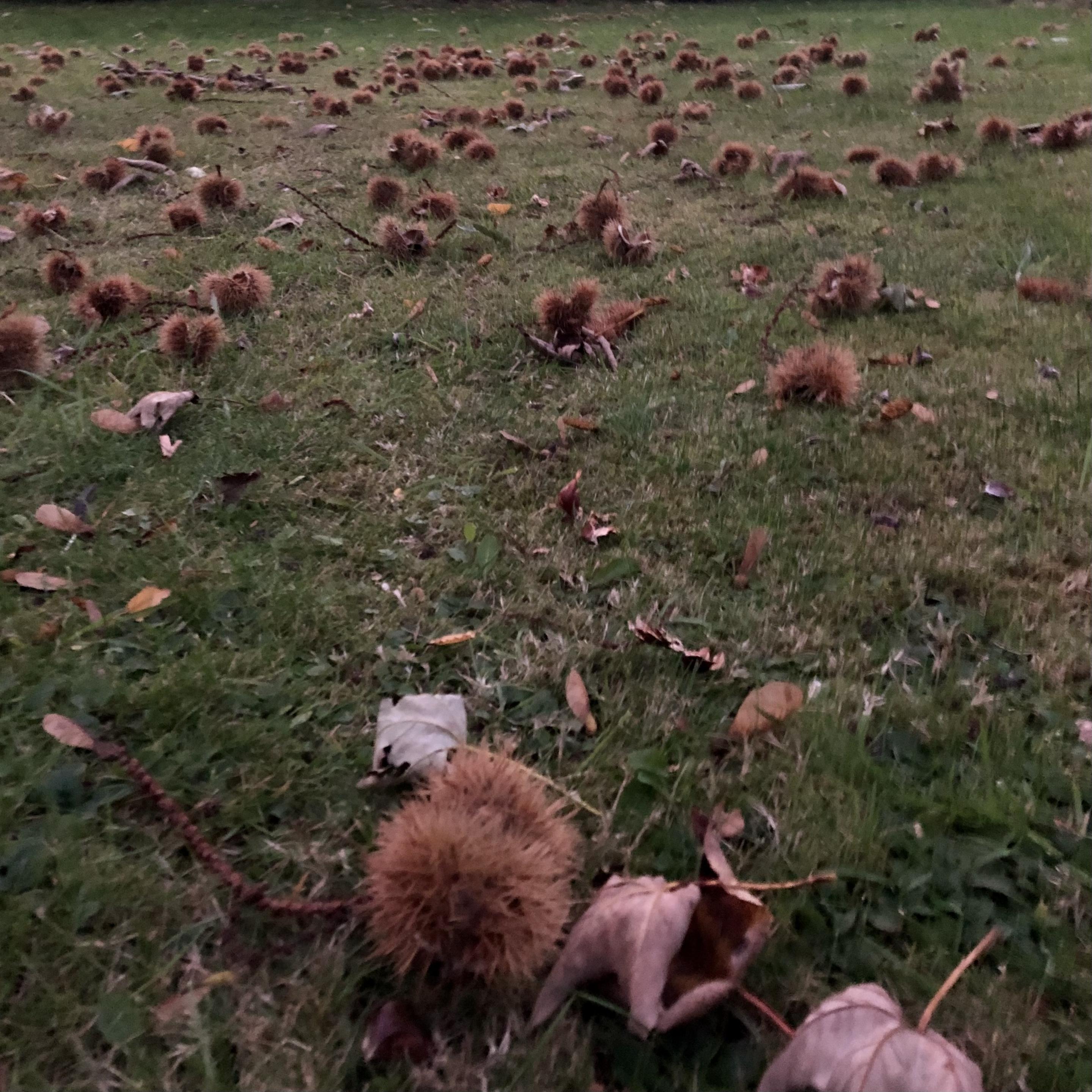 Aus den Raupenartigen Blüten sind Igelartige Fruchthüllen geworden. Vom Inhalt ist nicht mehr viel zu Sehen. Ist wohl beliebt bei den wilden Tieren.