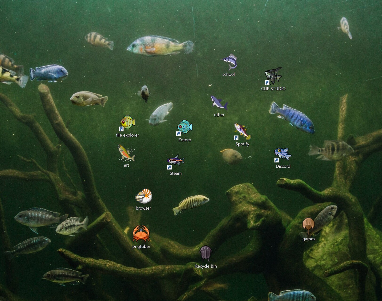 my desktop layout btw. if you even care ⦾ via https://twitter.com/mooooonbug/status/1693158976094183586 #desktop #fauna #marinefauna #workingspace #memes #dizayn #mooooonbug