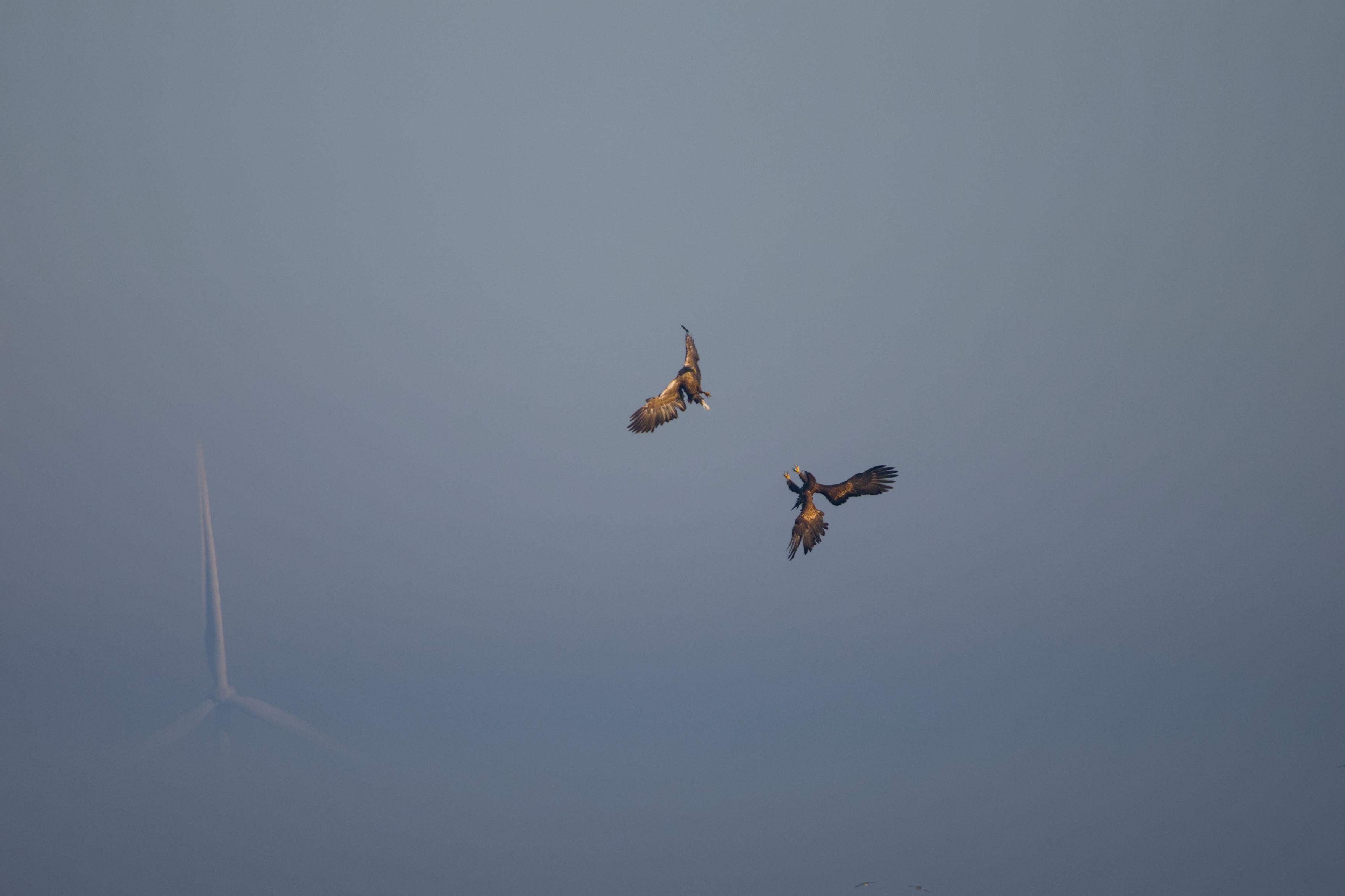 White-tailed eagles; adult and juvenile over the #Arkemheen polder. Their approach was alerted by many calls of birds fleeing. First they did some acrobatics before circling and moving farther south on their hunt.
